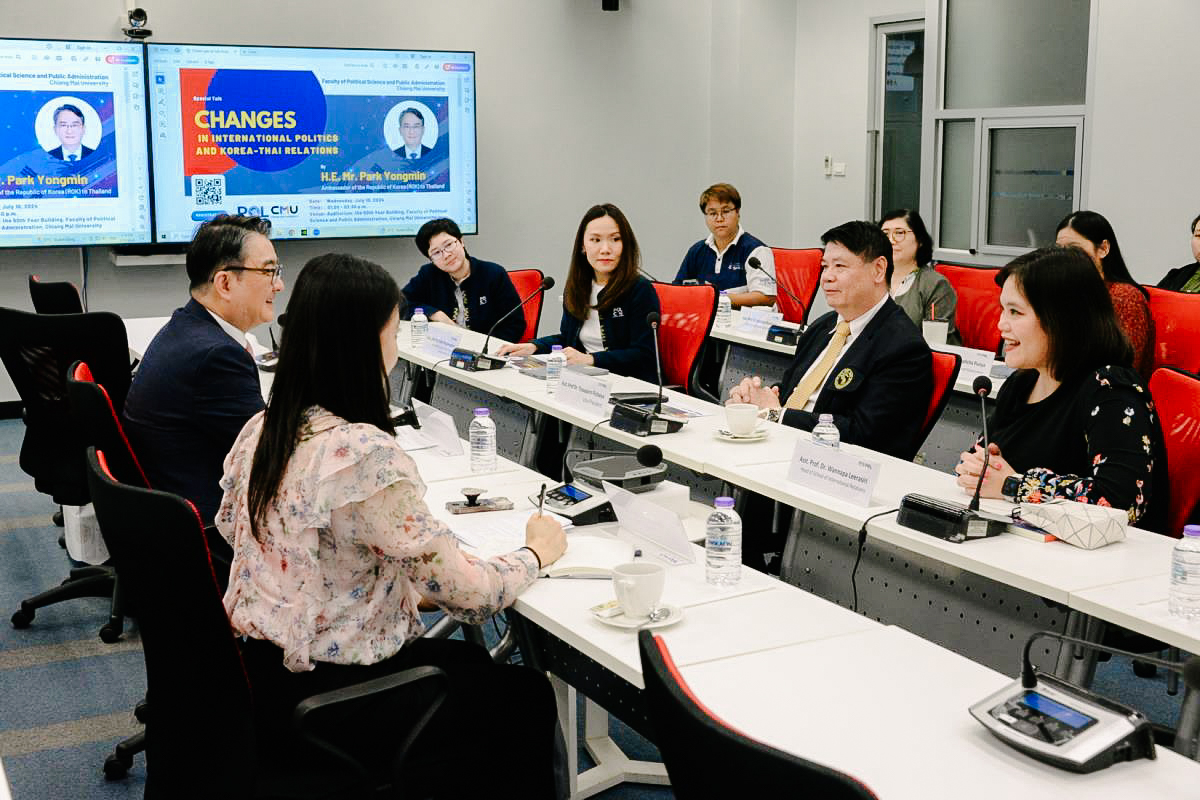 ผู้ช่วยศาสตราจารย์ทศพร พิชัยยา รองอธิการบดีมหาวิทยาลัยเชียงใหม่ และรองศาสตราจารย์ ดร.ไพลิน ภู่จีนาพันธุ์ พร้อมด้วยคณะผู้บริหารคณะรัฐศาสตร์ฯ ได้ร่วมให้การต้อนรับ H.E. Mr. Park Yongmin เอกอัคราชทูตสาธารณรัฐเกาหลี ประจำประเทศไทย ในโอกาสพบปะและให้การบรรยายพิเศษ แก่คณะอาจารย์และนักศึกษาคณะรัฐศาสตร์ฯ สาขาการระหว่างประเทศ เรื่อง Change in International Politics and Korea-Thai Relations” เมื่อวันพุธที่ 10 กรกฎาคม 2567 เวลา 13.00 -15.30 น. ณ ห้องประชุมใหญ่ อาคาร 50 ปีรัฐศาสตร์ฯ คณะรัฐศาสตร์และรัฐประศาสนศาสตร์ มหาวิทยาลัยเชียงใหม่