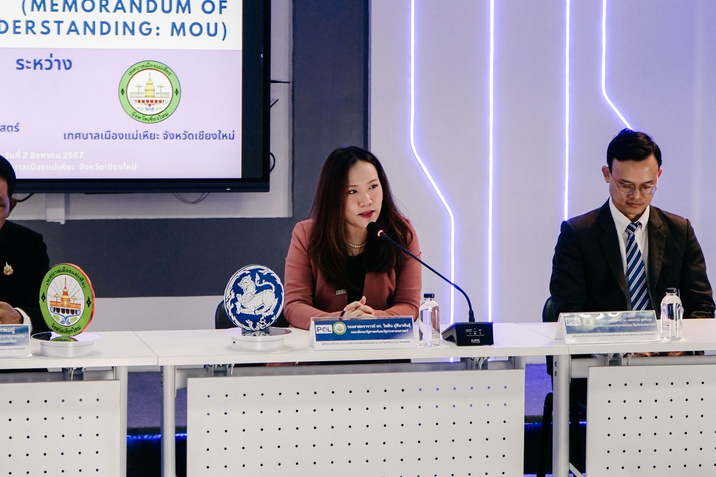 รองศาสตราจารย์ ดร.ไพลิน ภู่จีนาพันธุ์ คณบดีคณะรัฐศาสตร์และรัฐประศาสนศาสตร์ พร้อมด้วยผู้ช่วยศาสตราจารย์ ดร.อลงกรณ์ คูตระกูล รองคณบดีฝ่ายบริหาร ร่วมลงนามบันทึกข้อตกลงทางวิชาการ (MOU) ระหว่างคณะรัฐศาสตร์และรัฐประศาสนศาสตร์ มหาวิทยาลัยเชียงใหม่ และเทศบาลเมืองแม่เหียะ ให้เกียรติลงนามโดย คุณสมบุญ เทพอยู่ รองนายกเทศมนตรีรักษาราชการแทน นายกเทศมนตรีเมืองแม่เหียะ พร้อมด้วยคณะผู้บริหาร สมาชิกสภา หัวหน้าส่วนราชการ อาจารย์และนักศึกษา เข้าร่วมในพิธีการลงนามดังกล่าว ในวันที่ 2 สิงหาคม 2567 ณ ห้องประชุม ศูนย์ส่งเสริมทักษะและพัฒนาท้องถิ่นดิจิทัล ชั้น 1 เทศบาลเมืองแม่เหียะ