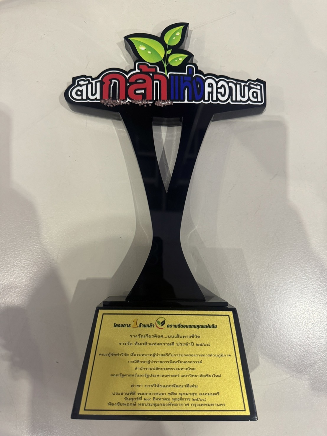 “ต้นกล้าแห่งความดี” สาขา ด้านการวิจัยและพัฒนาดีเด่น โดย มูลนิธิเพื่อสังคมไทยและสถาบันพัฒนาศักยภาพท้องถิ่น มีผลงานวิจัยเรื่อง