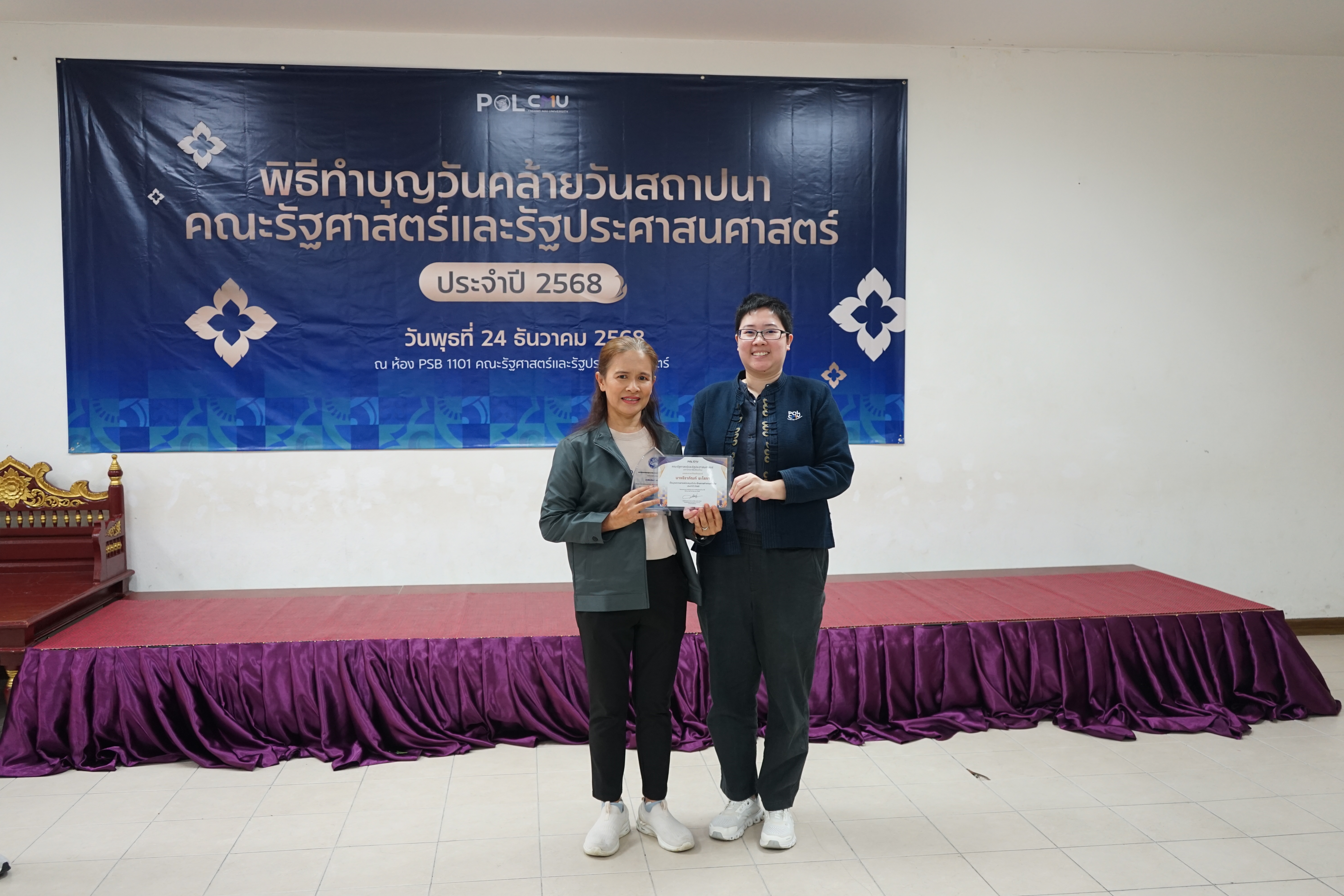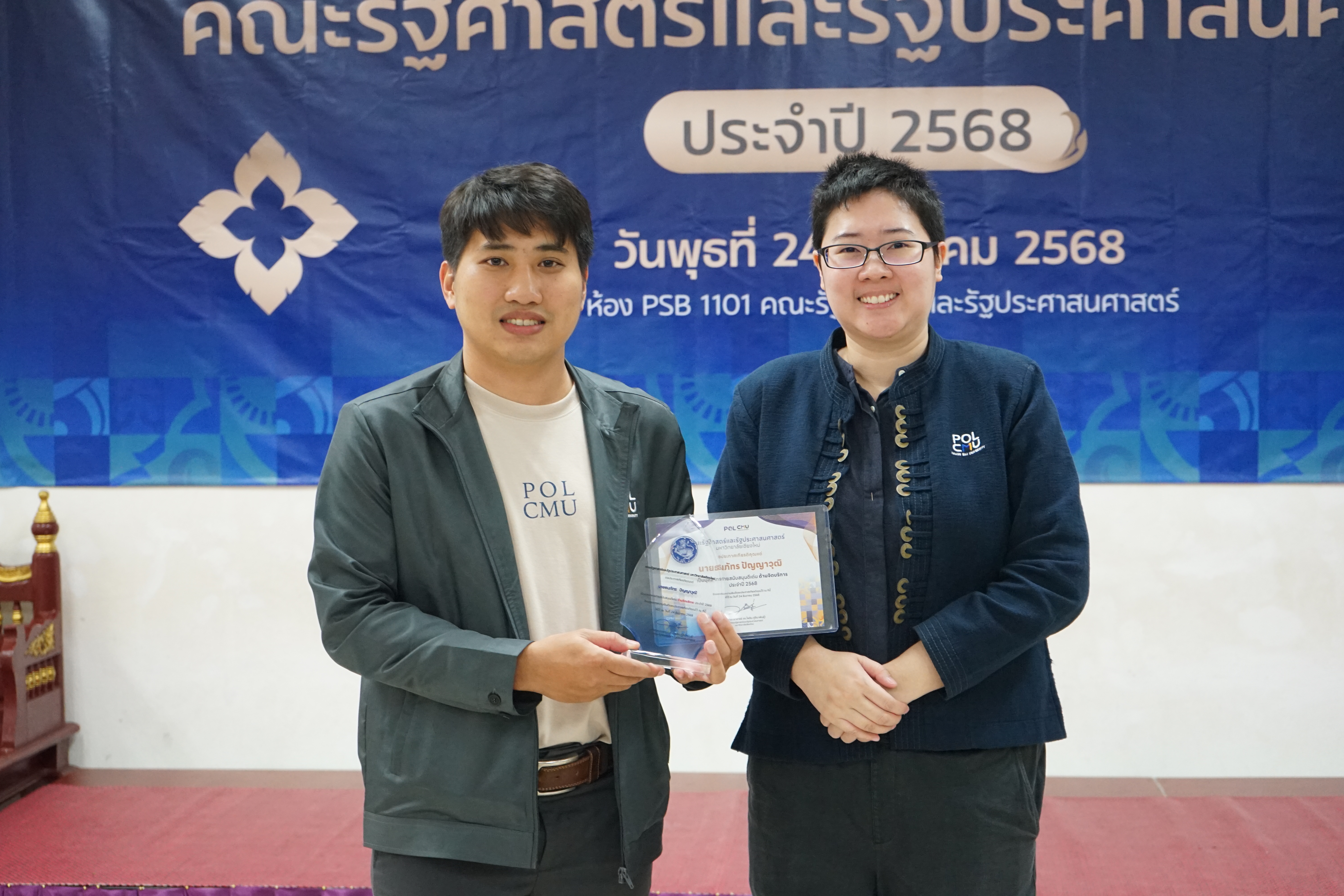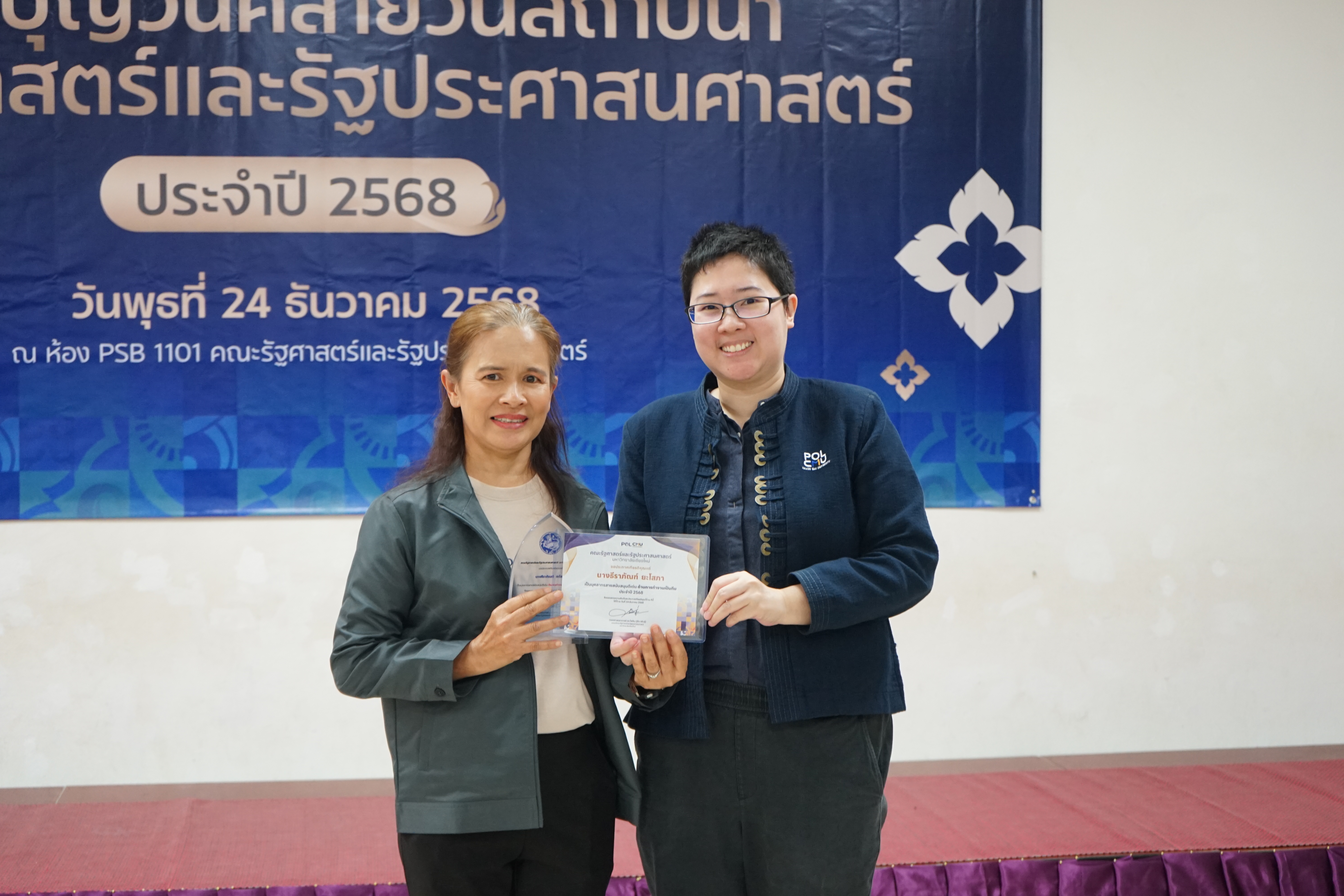 คณะรัฐศาสตร์และรัฐประศาสนศาสตร์ มหาวิทยาลัยเชียงใหม่ ได้จัดโครงการส่งเสริมบุคลากรผู้มีผลงานดีเด่น เพื่อยกย่องเชิดชูเกียรติและประกาศเกียรติคุณแก่บุคลากรที่มีผลการปฏิบัติงานเป็นที่ประจักษ์ ในโอกาสวันคล้ายวันสถาปนาคณะรัฐศาสตร์ฯ โดยในปี 2568 มีผู้ได้รับรางวัลบุคลากรดีเด่น ได้แก่🏆ประเภทบุคลากรสายวิชาการดีเด่น