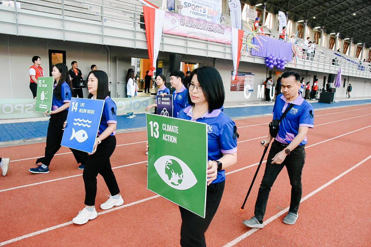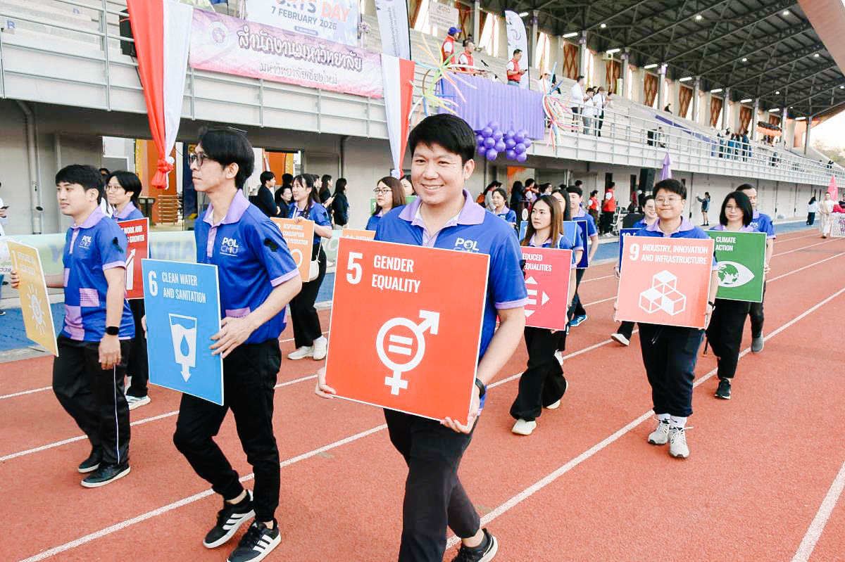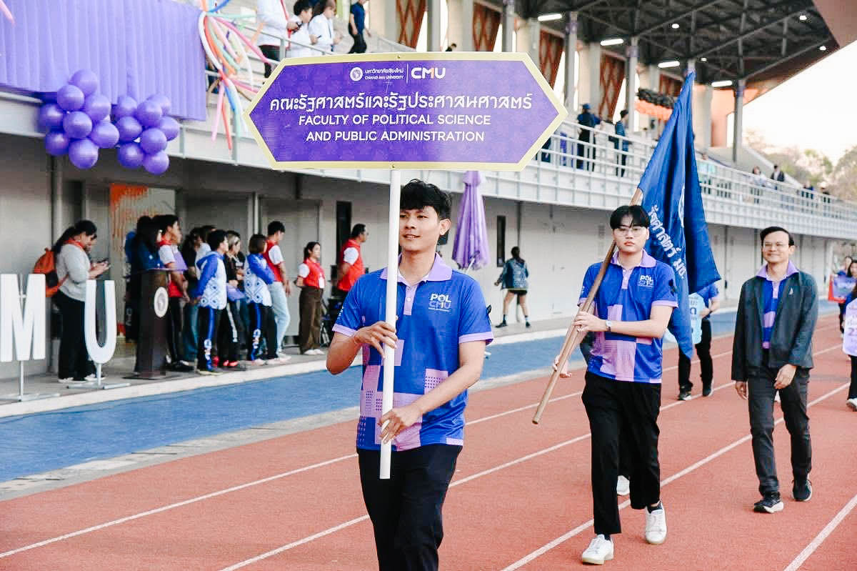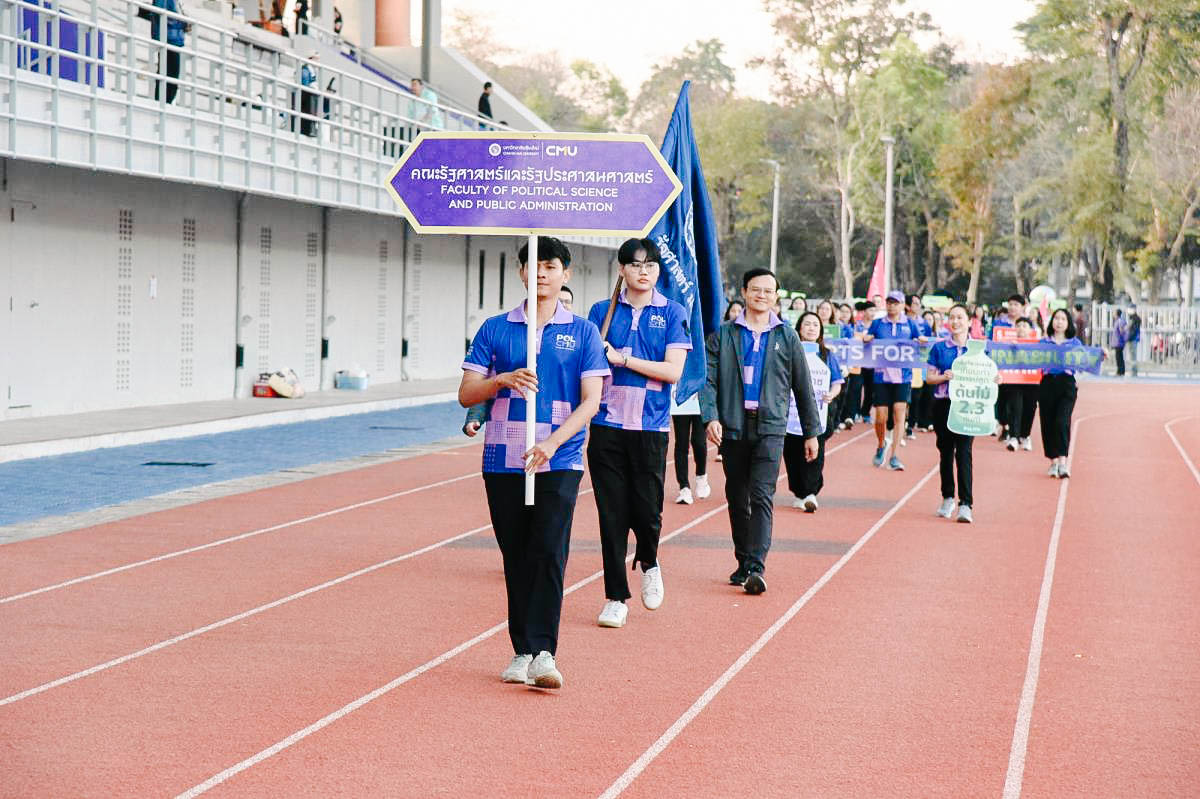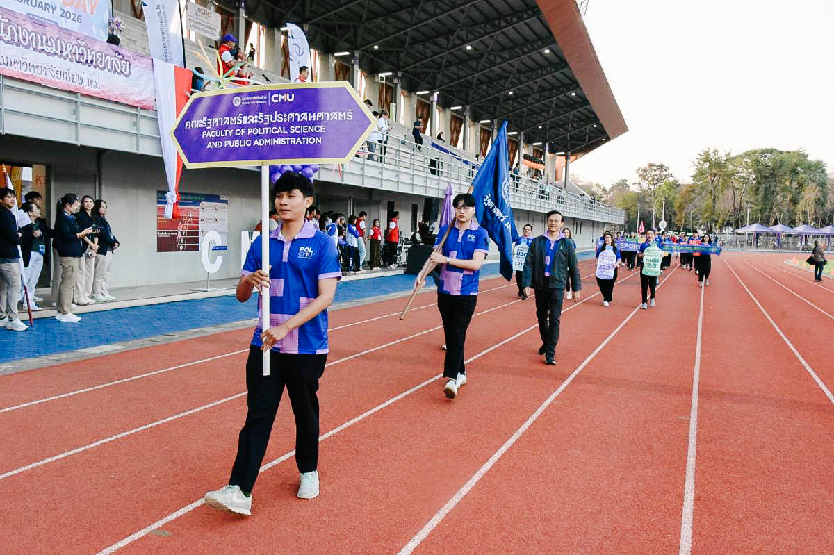 รัฐศาสตร์ฯ มช. ร่วมพิธีเปิดและขบวนพาเหรด กีฬาบุคลากรมหาวิทยาลัยเชียงใหม่ ประจำปี 2569 (CMU Sports Day 2026) ขับเคลื่อนนโยบาย “Sports for Sustainability” ส่งเสริมสุขภาพและรักษ์โลก 🏅♻️💪🏻♻️🌏 คณะรัฐศาสตร์และรัฐประศาสนศาสตร์ มหาวิทยาลัยเชียงใหม่ เข้าร่วมพิธีเปิดและกิจกรรมเดินขบวนพาเหรดในงาน กีฬาบุคลากร มหาวิทยาลัยเชียงใหม่ ประจำปี 2569 ภายใต้แนวคิด “Sports for Sustainability” โดยเลือกใช้เสื้อที่มีกระบวนการผลิตจากวัสดุรีไซเคิล 100 % เพื่อลดผลกระทบต่อสิ่งแวดล้อมและก๊าซเรือนกระจกอย่างยั่งยืน Sport Day รักษ์โลก Upcycling เปลี่ยนขยะเป็นพลังงานสะอาด ลดขยะขวดพลาสติกสูงสุด 1,110 ขวด เมื่อวันเสาร์ที่ 7 กุมภาพันธ์ 2569 ณ สนามกีฬากลาง มหาวิทยาลัยเชียงใหม่