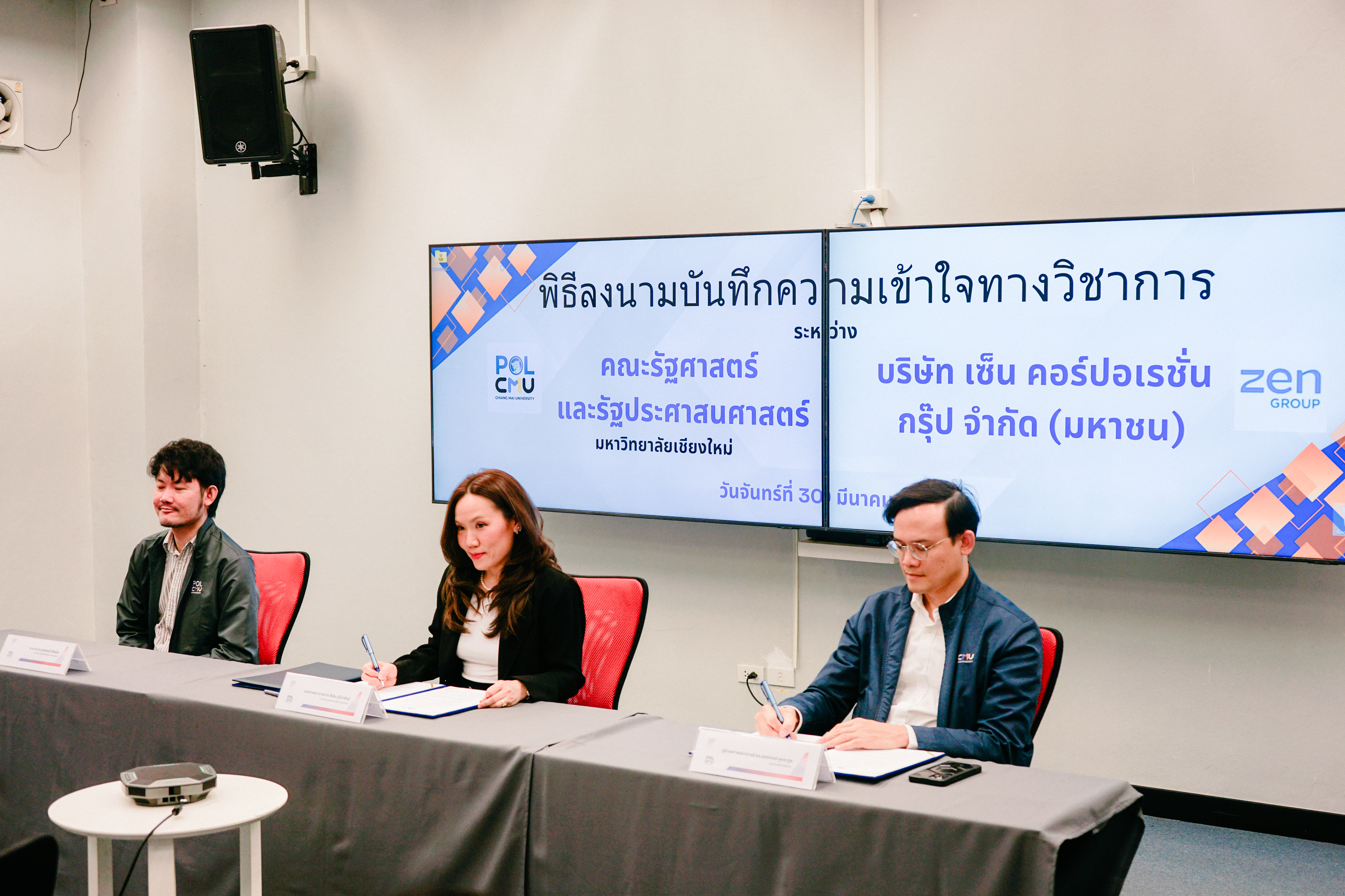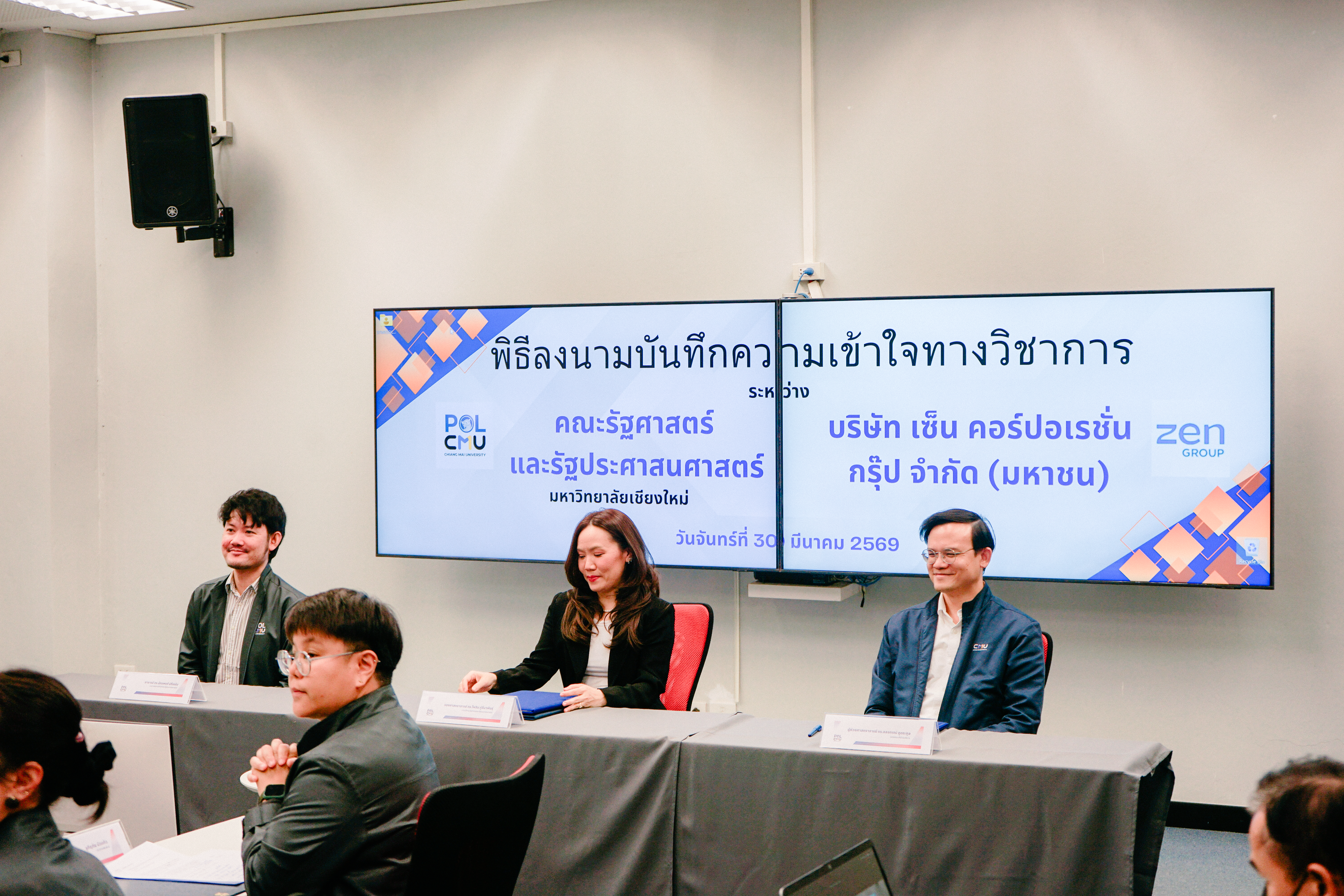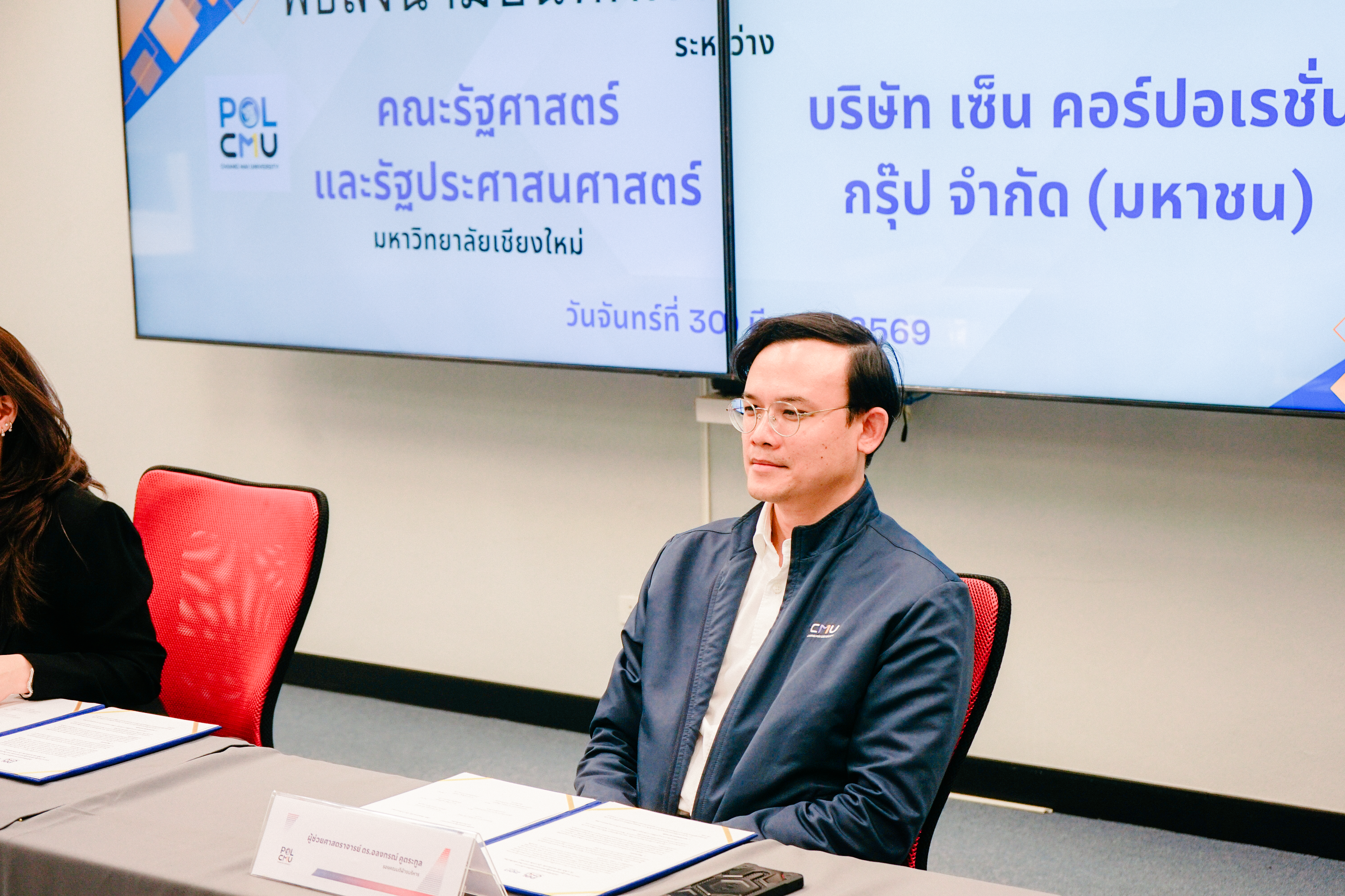 คณะรัฐศาสตร์ฯ มช. ลงนามความร่วมมือทางวิชาการ กับ บริษัท เซ็น คอร์ปอเรชั่น กรุ๊ป จำกัด (มหาชน) ยกระดับการพัฒนาทรัพยากรมนุษย์และองค์การเมื่อวันที่ 30 มีนาคม 2569 คณะรัฐศาสตร์และรัฐประศาสนศาสตร์ มหาวิทยาลัยเชียงใหม่ โดยรองศาสตราจารย์ ดร.ไพลิน ภู่จีนาพันธุ์ คณบดีคณะรัฐศาสตร์และรัฐประศาสนศาสตร์ มหาวิทยาลัยเชียงใหม่ ร่วมลงนามบันทึกข้อตกลงความร่วมมือทางวิชาการ กับ บริษัท เซ็น คอร์ปอเรชั่น กรุ๊ป จำกัด (มหาชน)