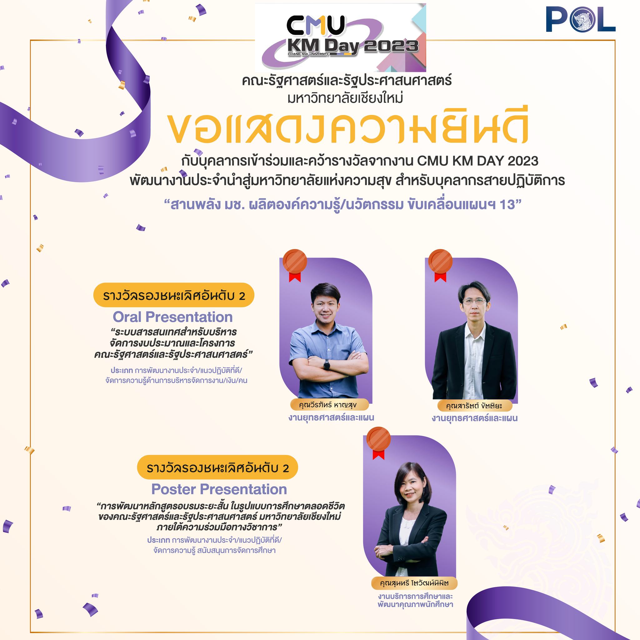 ขอแสดงความยินดีกับบุคลากรคณะรัฐศาสตร์และรัฐประศาสนศาสตร์ มหาวิทยาลัยเชียงใหม่ เข้าร่วมและคว้ารางวัลจากงาน CMU KM Day ประจำปี 2566 พัฒนางานประจำนำสู่มหาวิทยาลัยแห่งความสุข สำหรับบุคลากรสายปฏิบัติการ "สานพลัง มช. ผลิตองค์ความรู้/นวัตกรรม ขับเคลื่อนแผนฯ 13" ในวันที่ 8 กันยายน 2566 ดังนี้